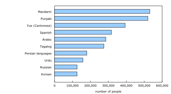 2021年,有53.1万加拿大人在家主要说普通话,另有52万人在家说旁遮普语。