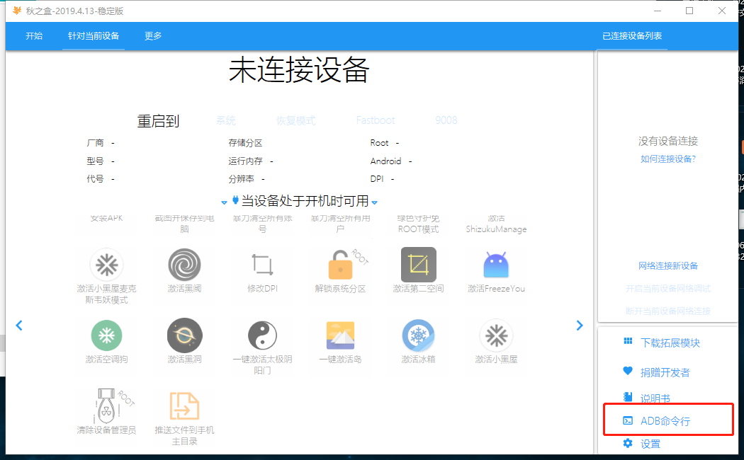 ADB命令启动十分简单,你可以通过大部分工具箱软件直接启动该服务,我比较常用的是“秋之盒”这一款开源免费工具箱,(搜索即可下载),这个工具箱包含了大部分常用命令,甚至可以一键开启冰箱、黑域等非root设备的辅助软件(最后一章再介绍)。