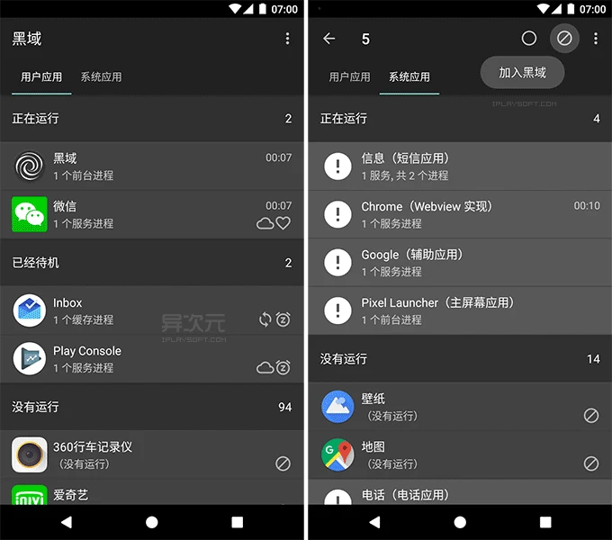 黑域通过事件智能判断您是否在使用应用,当您打开某个应用,使用完按下“返回”键之后,黑域就会“待机” (或称为休眠) 它;当待机超时,或者你手动从任务列表退掉该应用时,黑域就会“强行停止”它 (完全阻止其后台一切活动)。