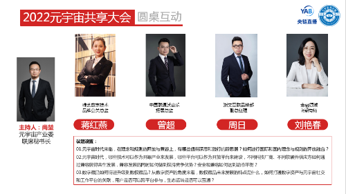 在圆桌互动环节,由元宇宙产业委联席秘书长、央链实验室执行主任尚堃主持,参与嘉宾有唯艺(杭州)数字技术有限责任公司品牌公关总监蒋红燕,中国联通沃音乐有限公司拓展总监曾超,浙文互联集团品牌部副总经理、爱创营销与传播高级副总裁周日,深圳袁宇宙科技有限公司CEO宋东来,金融领域IT架构师刘艳春。针对理念与规则、技术与应用、生态与用户共三个领域的“开放与兼容”进行了深度讨论,并形成高度认同。