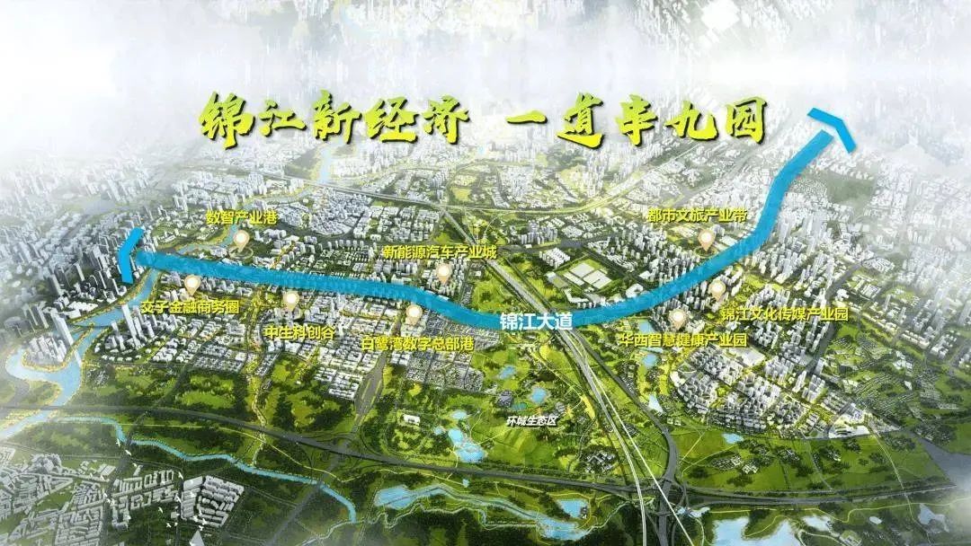 2022年6月最新规划显示,锦江区以锦江大道为轴,高质量规划了“一道九园”,“一道”为锦江大道,“九园”包含交子公园金融商务区、锦江数智产业港、中生科创谷、58数字生活城、白鹭湾科技生态园、新能源汽车商贸城、国际智慧康养产业园、都市文旅产业带、468数字文创谷等9个智慧产业园区。