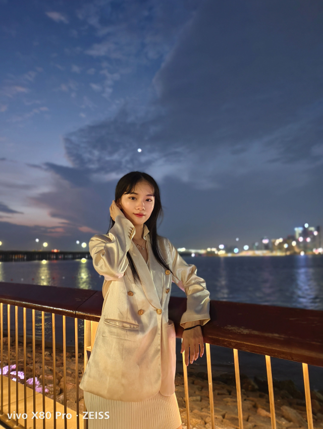 来到实拍部分,可以看到vivo X80 Pro在夜间的成像画面亮度一致性是非常好的,同时画面纯净度表现也不错,没有明显的涂抹感。另外,人物脸部的美颜效果也相当优秀,皮肤的质感较为出色。