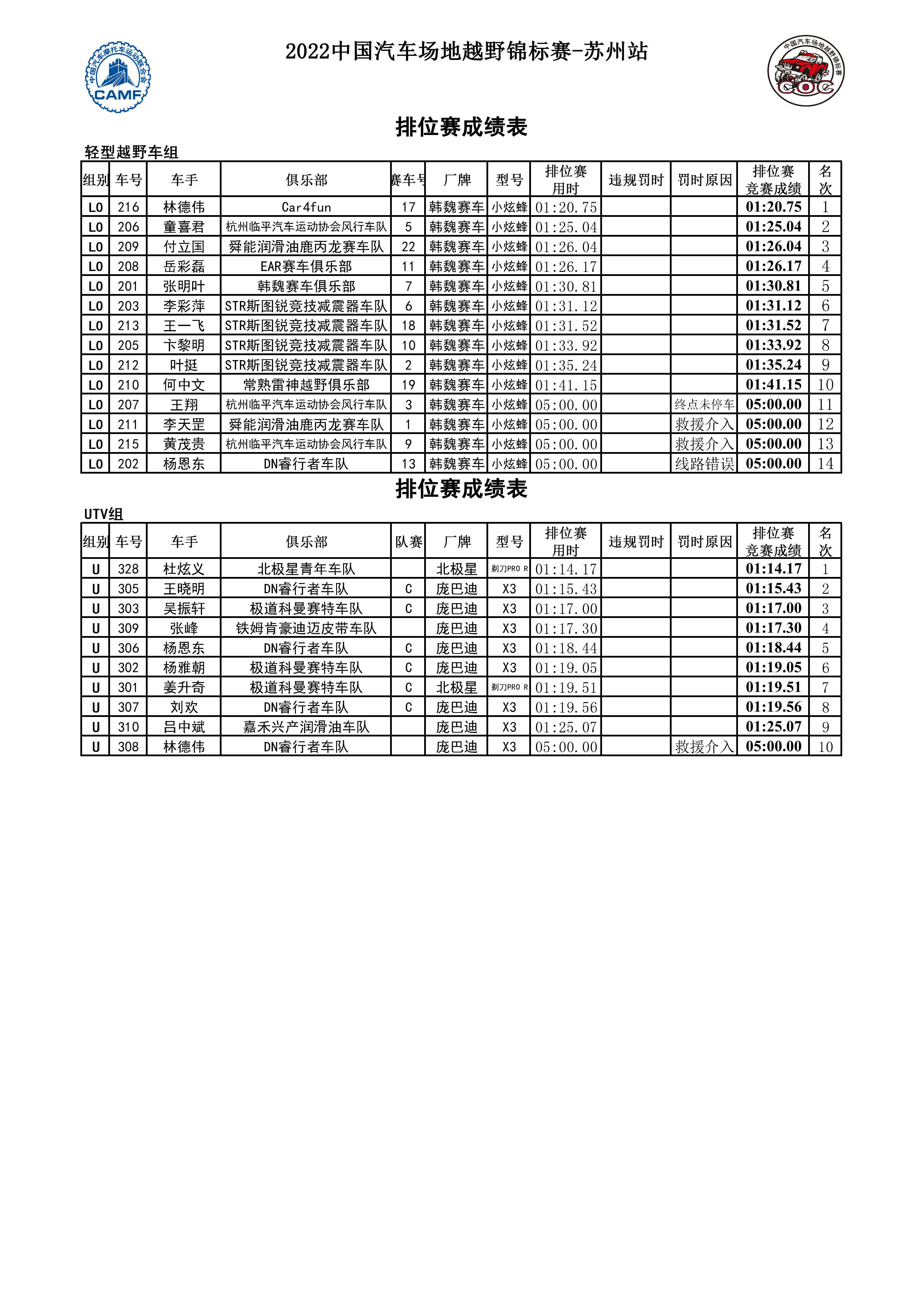 北极星青年车队杜炫义延续了揭幕战的出色状态,驾驶新款的北极星剃刀赛车创造了1分14秒17的全场最快成绩,DN睿行者车队王晓明和极道科曼赛特车队吴振轩分别排在组别第二、第三位。首次参加UTV组的中国台湾车手林德伟一度在比赛中展现了CRC冠军车手的速度,可惜在冲线的一刻失误翻车退赛。