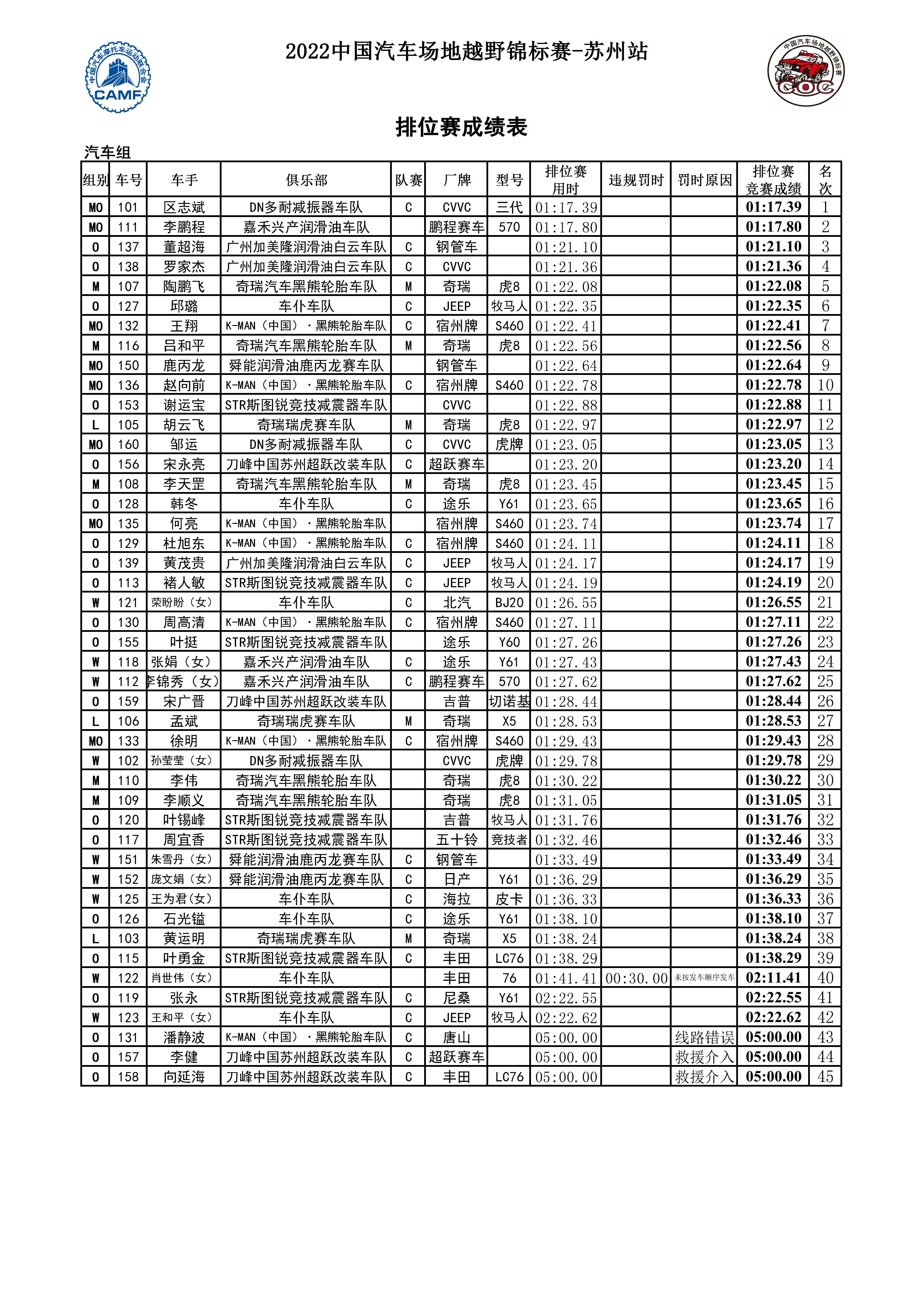8月18日,2022中国汽车场地越野锦标赛苏州站进行了排位赛的激烈争夺,DN多耐减振器车队年轻车手区志斌以1分17秒39的成绩排在汽车组首位,北极星青年车队杜炫义和Car4fun的林德伟分别获得UTV组和轻型越野车组第一名。