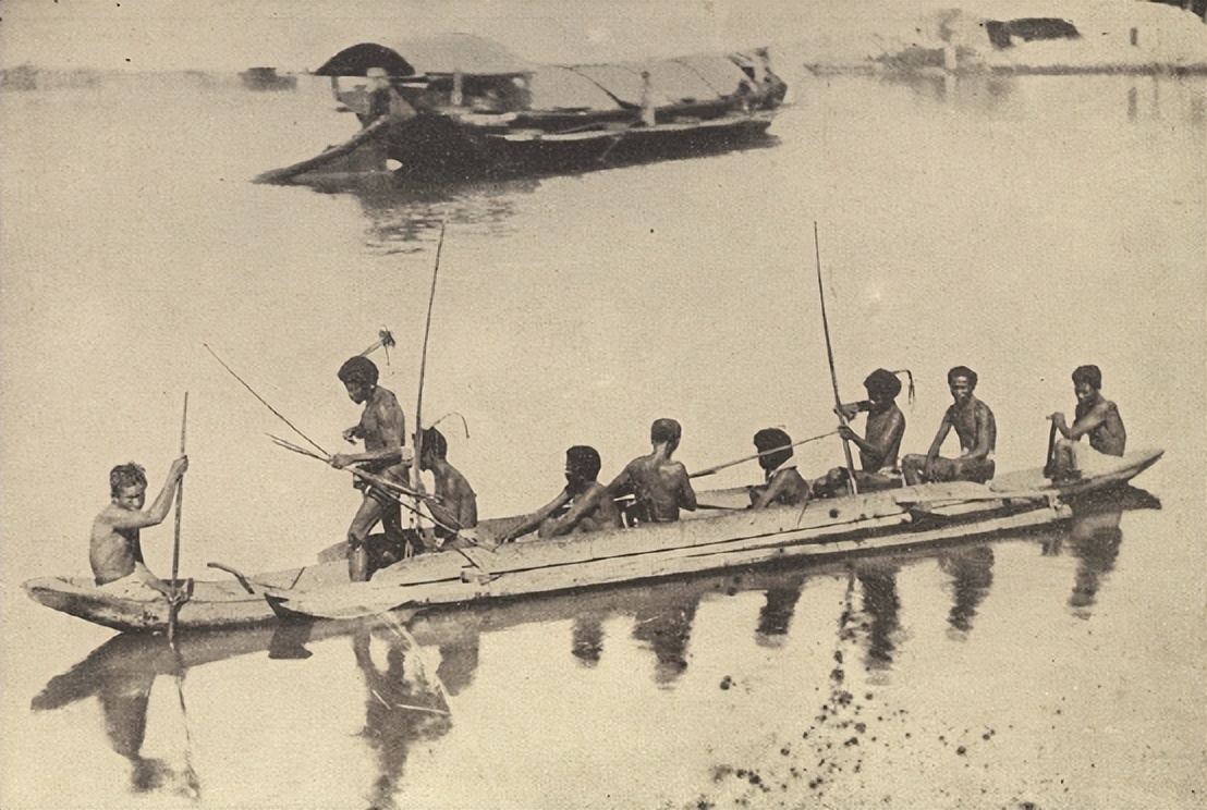 ▲1899年拍摄到的菲律宾渔船,可见是独木舟结构+舷外托架