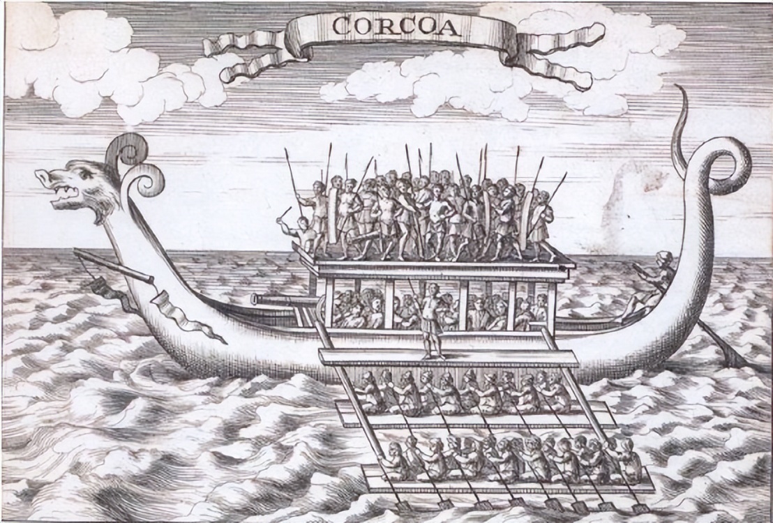 ▲18世纪雕刻的“卡拉科亚”战船,两门火炮安装在甲板上,船艏的雕塑似乎是野猪的怪物化处理