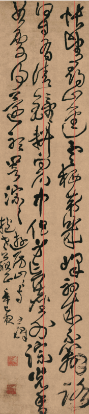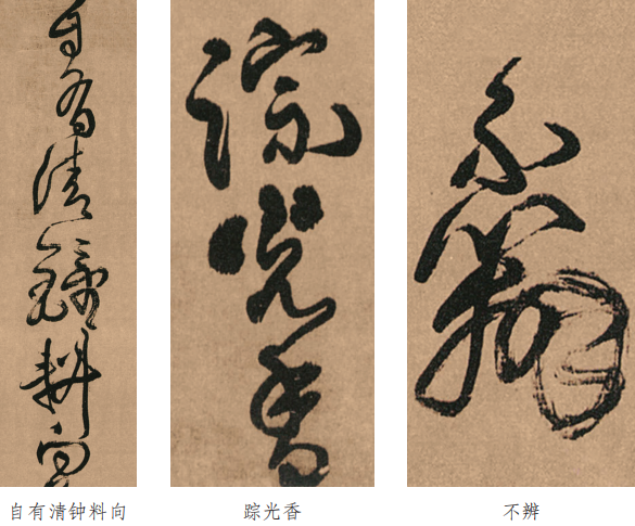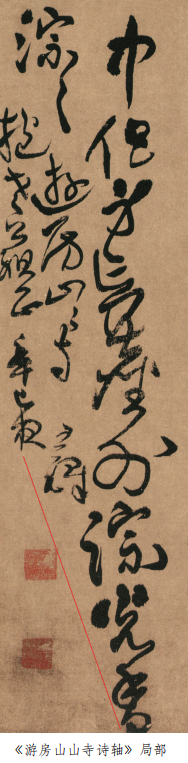 《游房山山寺诗轴》全帖40字,共有10个连接处。首行开始就是“怅然寻山径”五字相连,这在其他帖中是极为少见的。“忘尘”二字,上下两字的笔画直接粘接在一起,比黄庭坚的嵌入式连接更加紧实,草法不熟者是很难辨识其行笔轨线的。