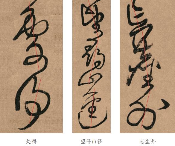 字势的欹侧变化,在没有位移的情况下,不导致行轴线大的摆动,“处得”即是。在字势的欹侧处理上,上字字势欹侧有变化了,下面一定有反方向字势的欹侧变化,这样保证了整体视觉上的相对稳定性,如“望寻山径”“忘尘外”。