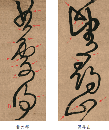 “曲处得”左边箭头所指的折均从线条的下部折出,取自篆籀笔法。折后的横画如果单从起笔处看,完全就是篆隶横画的起始用笔方法。临写时注意A、B、C三处的用笔。A处提笔调锋,B处完全从上笔画逆回,C直接调锋折出。右边的折均为圆折,为外拓绞转用笔。“望寻山”箭头所指的折,均为具有方意的折,具体是顺折还是逆折,临写时要用心揣摩分析。