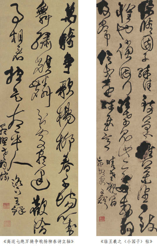 王铎行草书《高适七绝万骑争歌杨柳春诗立轴》,线条粗细变化较大。同样是长轴幅式,和《游房山山寺诗轴》相比,气势就减弱很多。