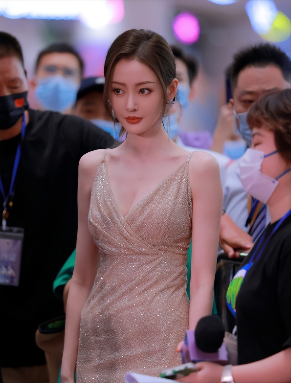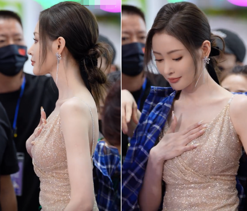 穿着吊带金色V领礼服现身的张天爱穿着打扮十分清凉,站在人群中尤为抢眼,因为不想在上场前吸引太多的注意力,害羞的张天爱还特意用手遮挡胸口。