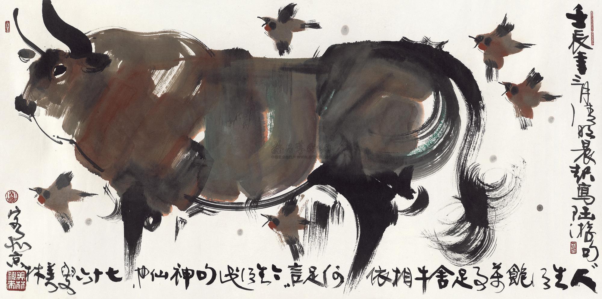 题识:辰年三月清明,晨起写陆游句。人生得饱万事足,舍牛相依何足言。今生得此句神仙也。七十六叟美林客北京