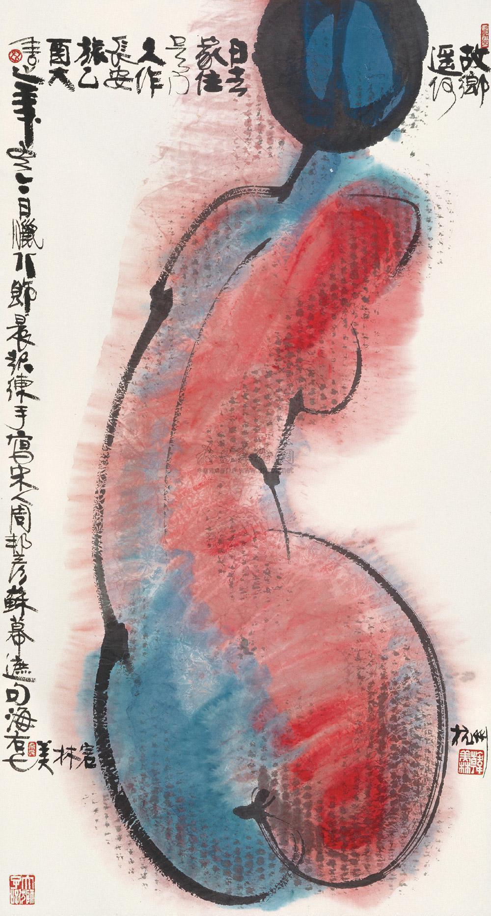 拍品名称:韩美林 乙酉(2005年)作 彩色人体 镜心