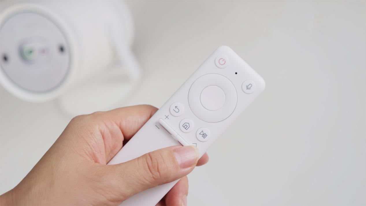 另一个亮点就是The Freestyle三星随享配备了非常好用的遥控器,同样是白色的极简设计,并且使用时无需对准投影仪,在附近任意位置均可操控。