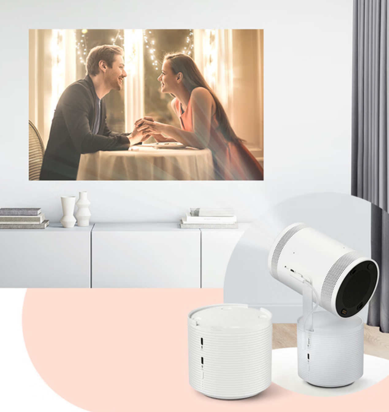 在理想状态下,只要正对被投射的墙面并预留足够距离,The Freestyle三星随享可实现最大100英寸的投影面积,投射比是1.2:1。现实体验中,一般两室一厅的客厅预留1.5米左右的投影距离,即可拥有约60英寸左右的观影效果。这款投影仪的投影分辨率为清晰的1080P,足够满足家庭或自己使用。