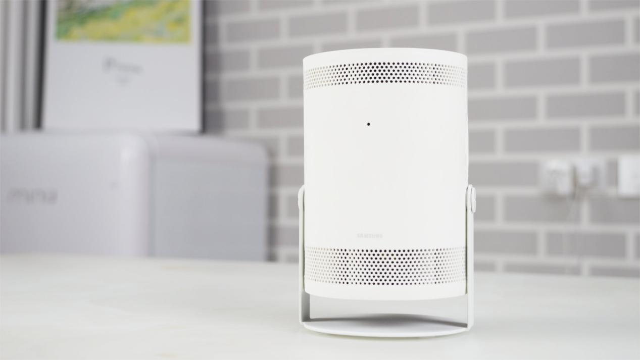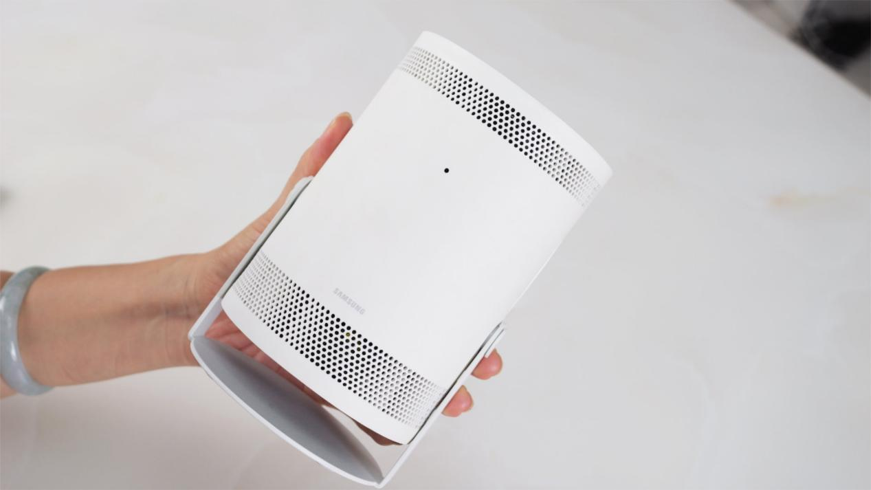 外观方面,The Freestyle三星随享可以用小巧精致来形容。可旋转调节角度的圆柱形主体设计,通体白色材质也很有科技感,让其摆在桌上都是一个非常有气质的桌搭产品。整机重量仅为0.8kg,尺寸为102.4 x 172.8 x 95.2mm,无论男女生均可单手轻松握持——犹如一款大号运动水杯,这意味着它有着非常强的便携性。就像文章开头提到,消费者可以在众多场景使用The Freestyle进行投影。