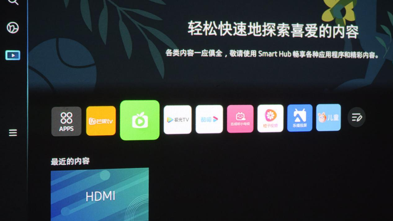 The Freestyle三星随享拥有三星自研智能电视系统Tizen 6.5——这套可视化界面的确很好用。相比国内电视千篇一律的界面设计,三星选择将常用主流视频应用前置,用户一般来说只会开1~2个会员,直接点击常用App即可。