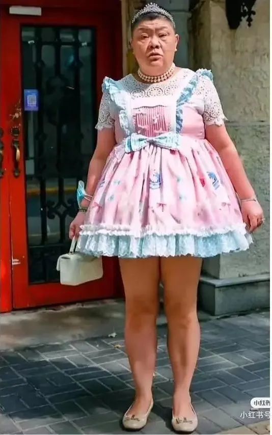照片的主角留着寸头,身材有些圆润,脸上也饱经风霜,却身穿可爱的洛丽塔裙子,头戴精致的小皇冠,把自己打扮成公主的样子。
