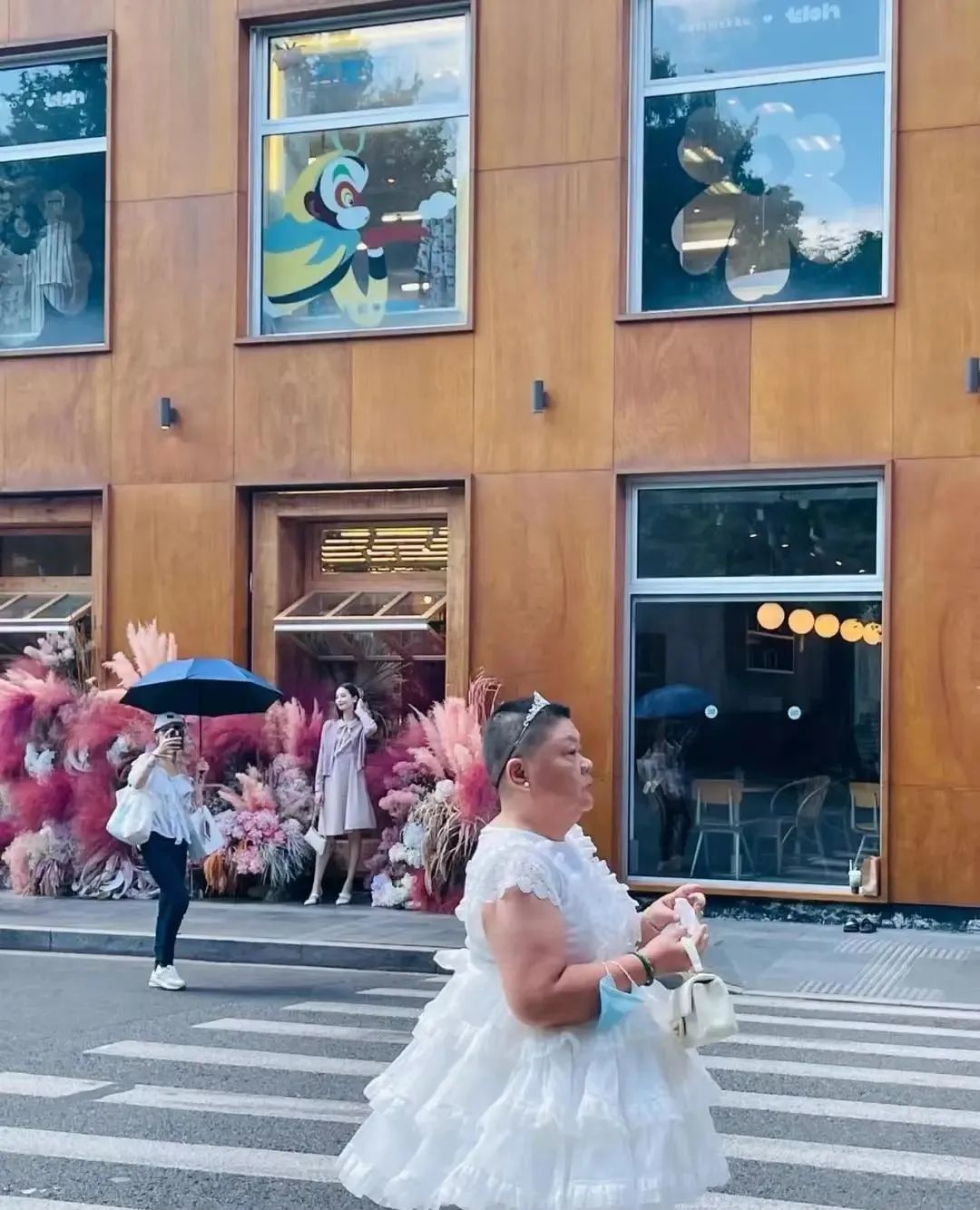 在时尚男女扎堆的安福路,这出格的形象与其他人形成了巨大反差,引得行人侧目、摄影师围堵。