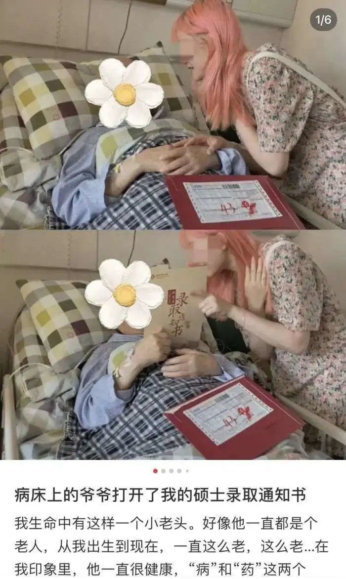 还有那个粉色头发的女孩,在网上分享了一张自己带着录取通知书去医院看望爷爷的照片。