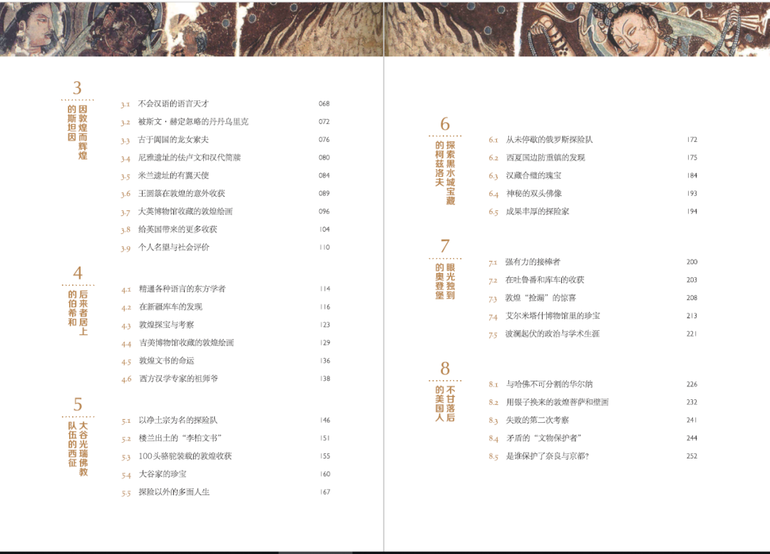在此后的章节中,作者同样以人为纲,讲述了德国的格伦威德尔和勒柯克,英国的斯坦因、伯希和,日本的大谷光瑞,俄国的柯兹洛夫、奥登堡,以及美国的华尔纳等人在新疆各地、甘肃敦煌、内蒙古黑水城等地的掠宝行动。