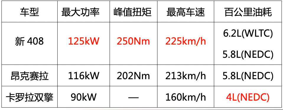 需要指出的是,首先由于在价格相近、且都是各自高规格动力的三款车型中,新408 1.6T逐梦版为高配车型(其实官方售价在三车对比中反而最低),而卡罗拉双擎和昂克赛拉2.0L自动质擎版则为中低配车型,新408有着后发先至的优势,在潮流、实用配置上新408比对手显然更加丰富一些。