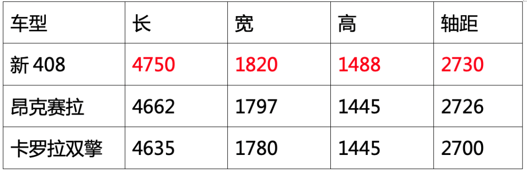 点评:在车身数据这一项对比中,降维作战的新408有着肉眼可见的优势,甚至可以说有点“不讲武德”。至于实际空间感受,极车君可以保证的是:新408的后排空间的确是三车中最宽裕的,而这一点对于一台在使用中需要重点照顾到后排乘客感受的A级家轿来说,至关重要。