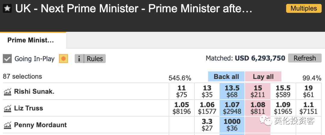 值得一提的是,在戈夫官宣支持苏纳克后,特拉斯和苏纳克两人当选英国首相的赔率并无明显变化。
