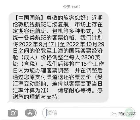 据多名读者最新反馈,原本花了人民币2.8万元购买国航10月1日回国直飞机票的他们,在近日收到国航短信称,国航计划将2022年9月17日-10月29日之间的伦敦至上海经济舱票价降为每人2800英镑(含税),约合人民币2万2549元,之前已购票的旅客将因此也将收到几千元的退款,具体退款额以客票变更当日汇率为准。
