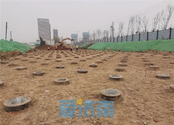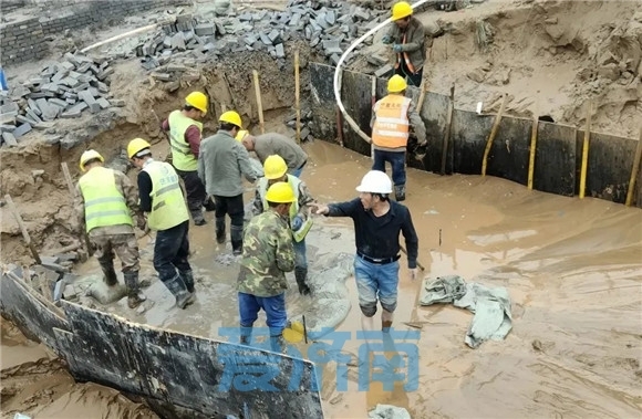 项目地处黄河泥滩,土质差,极易出现渗水塌方。为了实现高效降水,项目采用“盲沟明排+管井降水”法,即利用深挖沟槽将降水井连通,采用8台大功率抽水设备,通过汇聚管井集中抽水。施工管理人员昼夜不停,历时4天降排水约5000立方米,困扰项目进展的高地下水位难题得到解决,保证了项目后续建设稳步进行。