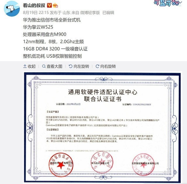 华为的自研能力毋庸置疑,新台式机的曝光也证实了这一点。微博用户“看山的叔叔”曝光了华为一款台式机的信息,称华为推出信创市场全新台式机,型号为华为擎云W525。这款台式机特殊的地方在于,其采用了华为自研CPU ,并且搭载国产操作系统。