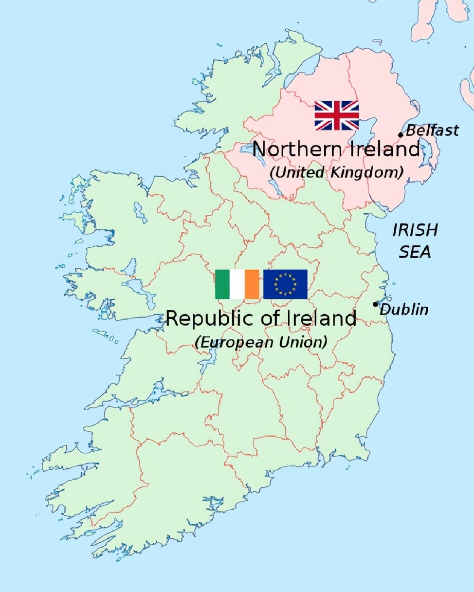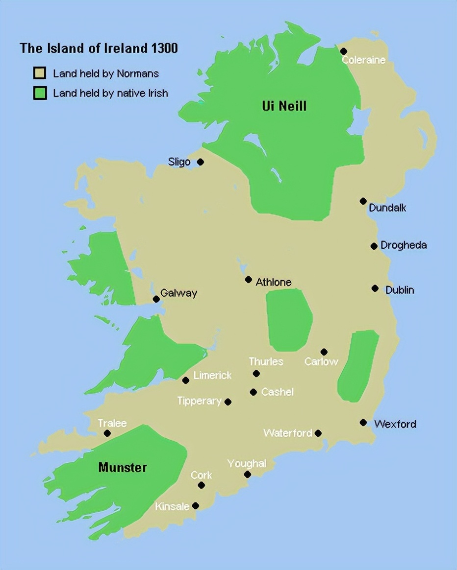 ▲1300年的爱尔兰地图,绿色为土著控制区,棕色为英国殖民者征服区