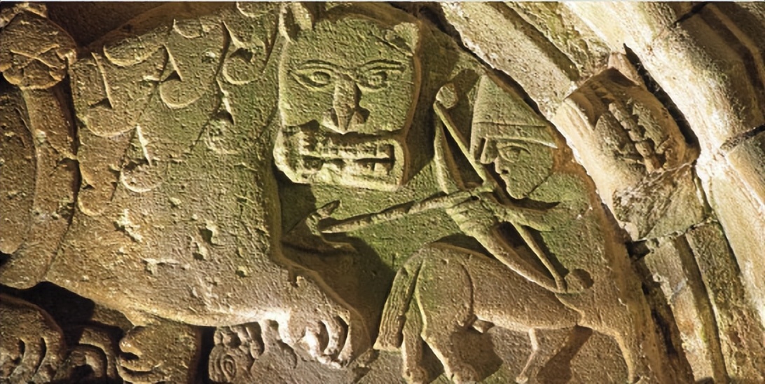 ▲12世纪早期科马克教堂上的浮雕,半人马戴着同时期爱尔兰武士常用的头盔