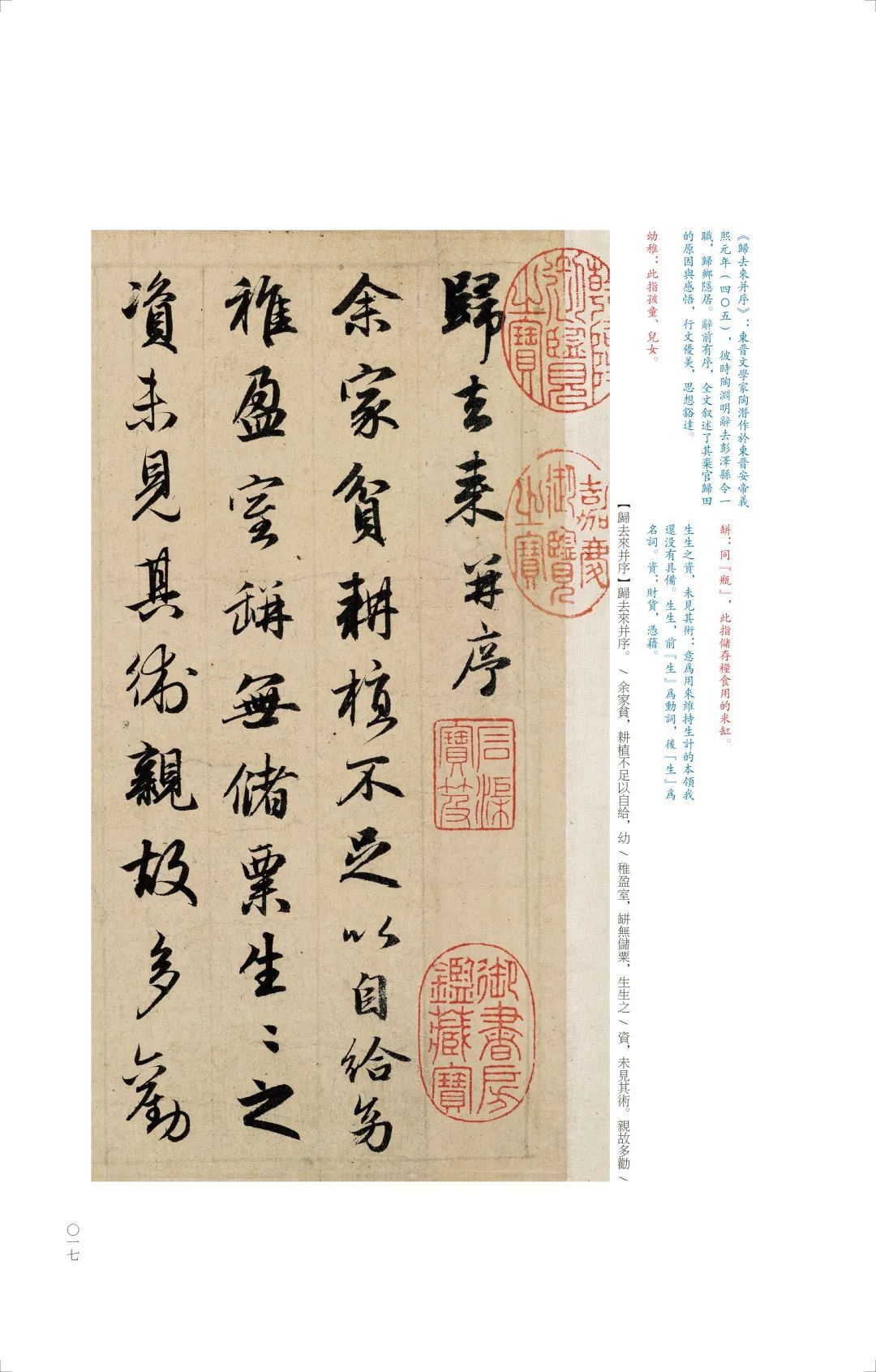 •《归去来并序》,纸本,无纪年。所书系东晋陶潜著名的《归去来兮辞》,是文学史上的辞赋名篇。赵孟頫一生曾多次书写,卞永誉《书画汇考》收录的倪中题跋谓“赵文敏书《归去来辞》,南北所见无虑数十本,或真或行,各极精好”,可见其寄托归隐之意颇深。本书此卷今藏辽宁省博物馆(现另存两卷,分别藏于上海博物馆与湖州博物馆)。本卷为赵氏典型书风,用笔骨肉匀健,精气爽朗,全篇婉转流美,遒劲姿媚,颇具晋人风范,深得“二王”书旨。卷首钤有“乾隆御览之宝”“嘉庆御览之宝”“石渠宝笈”“御书房鉴藏宝”等印,卷尾钤有“三希堂精鉴玺”“宜子孙”“乾隆鉴赏”“赵氏子昂”“天水郡图书印”等印。