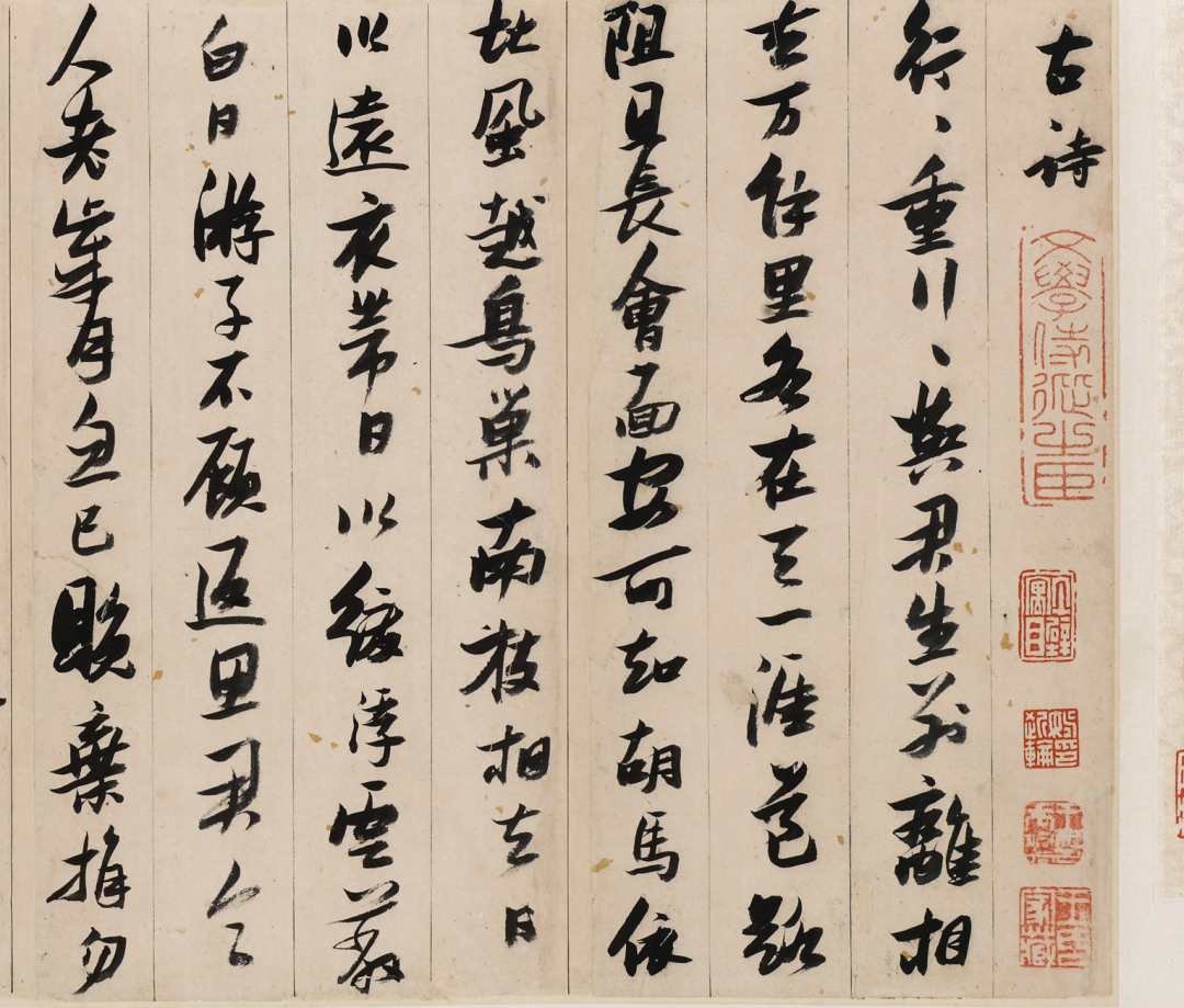 •《草书古诗十九首》,纸本,今藏何创时书法艺术基金会。内容源自《文选》,系南朝梁昭明太子萧统从传世佚名古诗中选十九首录编而入,是文学史上的名篇。是卷笔法劲健,结体拙野,布局参差掩映,气势纵横,气骨苍老,与传统二王书风迥异。