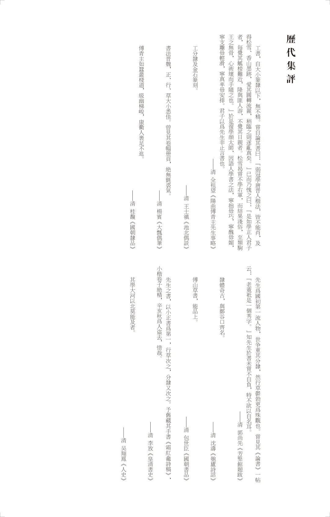 • 傅山,明末清初书画家、思想家、医学家。初名鼎臣,字青竹,后改字青主等,太原人。其倡导的“宁拙毋巧,宁丑毋媚,宁支离毋轻滑,宁真率毋安排”的书学主张,在书史上影响深远。