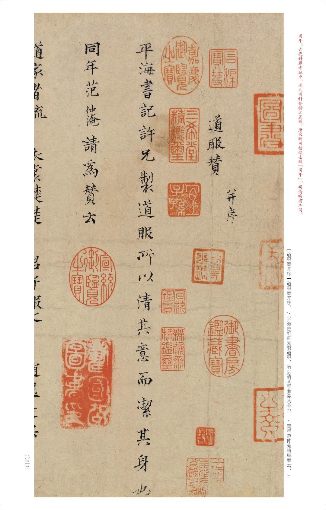 •《道服赞并序》,纸本,楷书。该帖风骨劲爽,精到清整,严肃沉着,如精金美玉。后有文同、戴仁、吴宽等名家题跋,现藏故宫博物院。