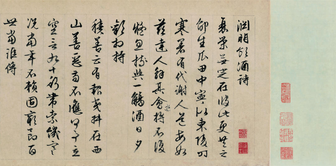 • 文征明《行书陶渊明饮酒诗》,纸本,今藏何创时书法艺术基金会。此卷作于明嘉靖三十四年乙卯(一五五五)夏七月三日,文征明时年八十六岁。所书为东晋诗人陶潜《饮酒诗二十首》。此卷为文氏晚年典型书风,兼二王、赵孟頫趣味,特多《集王圣教序》之影响,虽系暮年所书,而用笔劲健飞扬,温纯精绝,法度森然,一丝不苟。明潘之淙《书法离钩》论文征明书曰:“草师怀素,行仿苏、黄、米,晚岁取《圣教》损益,加以苍老,遂自成家。”明谢肇淛《五杂俎》谓:“极意结构,疏密匀称,位置适宜,如八面观音,色相具足。”于此卷皆可印证。