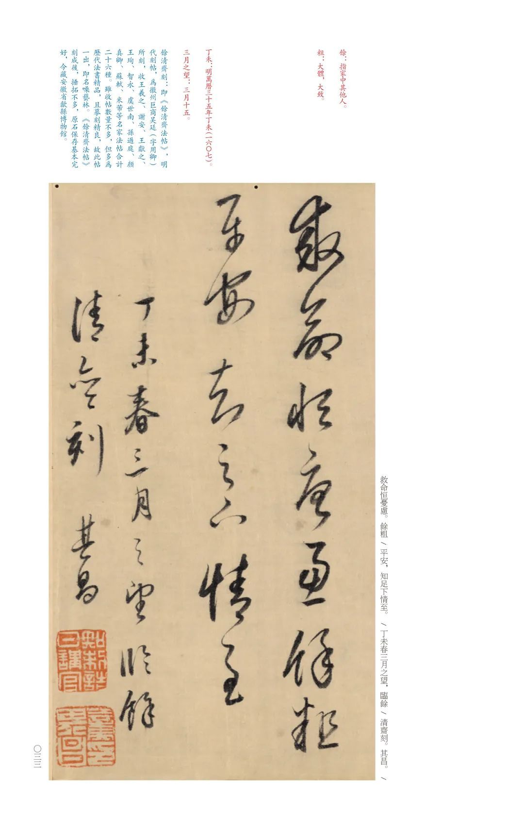 • 本卷所书之书论二则,应是董其昌自撰,但未见于《容台集》《画禅室随笔》等董氏文集中,可补史料之缺。《余清斋法帖》为徽州巨商吴廷所刻,收历代名家法帖二十六种,内有王羲之法帖十种,《十七帖》为其中之一。董其昌与吴廷友善,亲自参与了《余清斋法帖》的编选过程,并为之题额、评鉴。本卷董其昌临《余清斋法帖》之《十七帖》部分,虽为临写,但挥运自如,自出胸臆,飘逸空灵,全无滞塞。其中文字偶有脱漏、增衍,当系书写时专意于用笔,而无暇顾及文句所致,瑕不掩瑜。