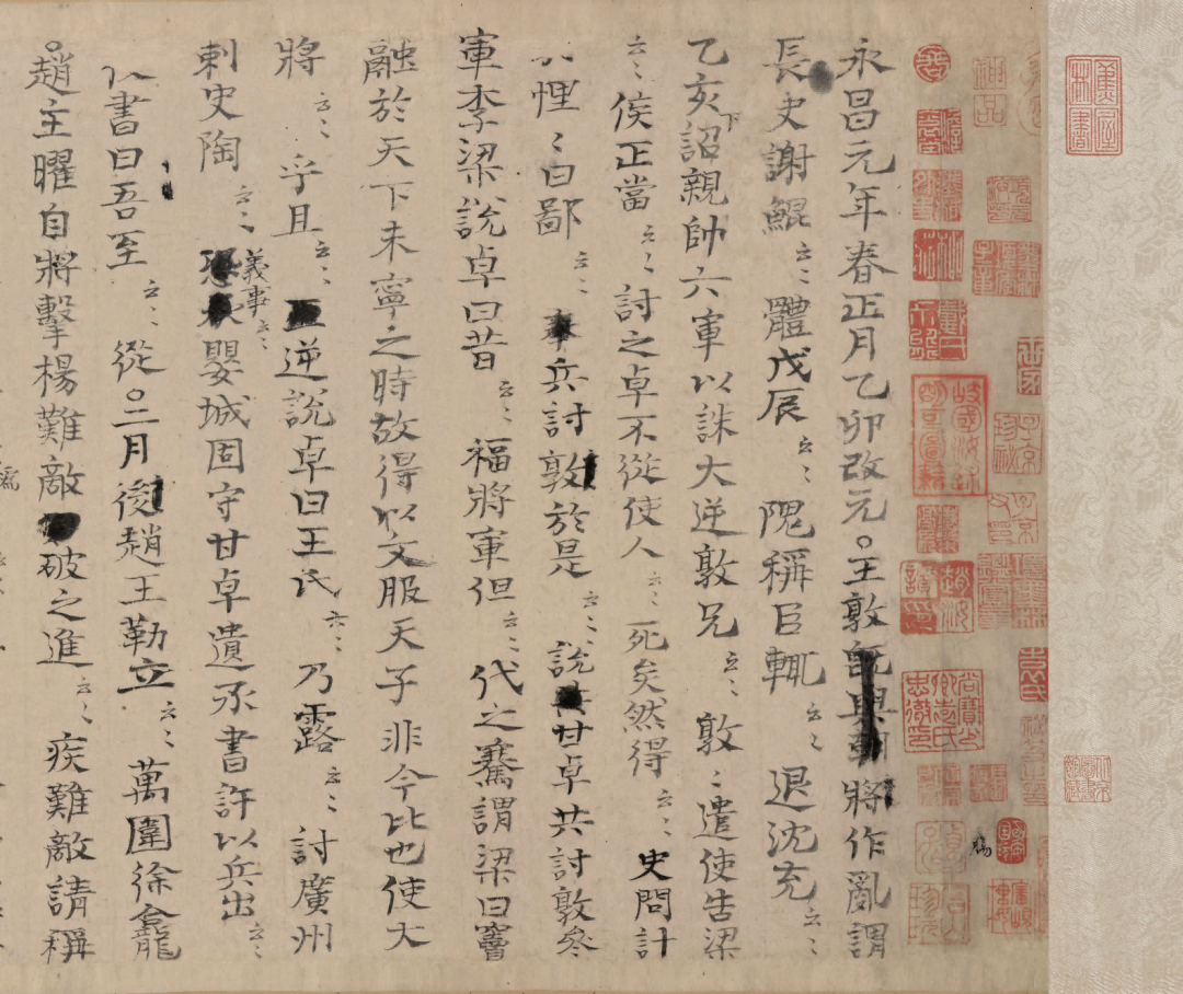 •《资治通鉴残稿》,纸本,楷书,现藏中国国家图书馆。其字兼有真、隶特点,用笔提按分明,结体规整扁平,别具面貌。