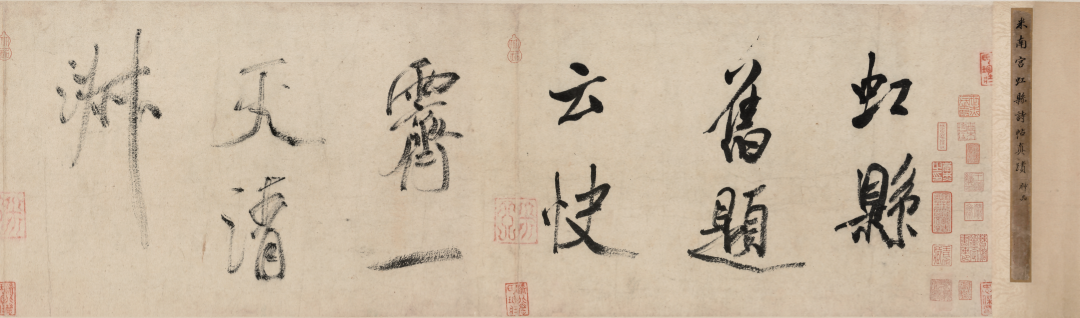 •《虹县诗卷》纸本,行书,自书七言诗两首。米芾其时途经虹县,见风景明丽,故作此诗。其书体势浑然,得趣天成,后有金刘仲游、元好问,清王鸿绪跋,与《研山铭》皆为米芾大字名迹,殊为珍贵。今藏日本东京国立博物馆。