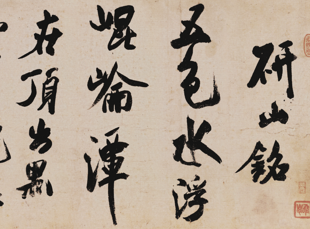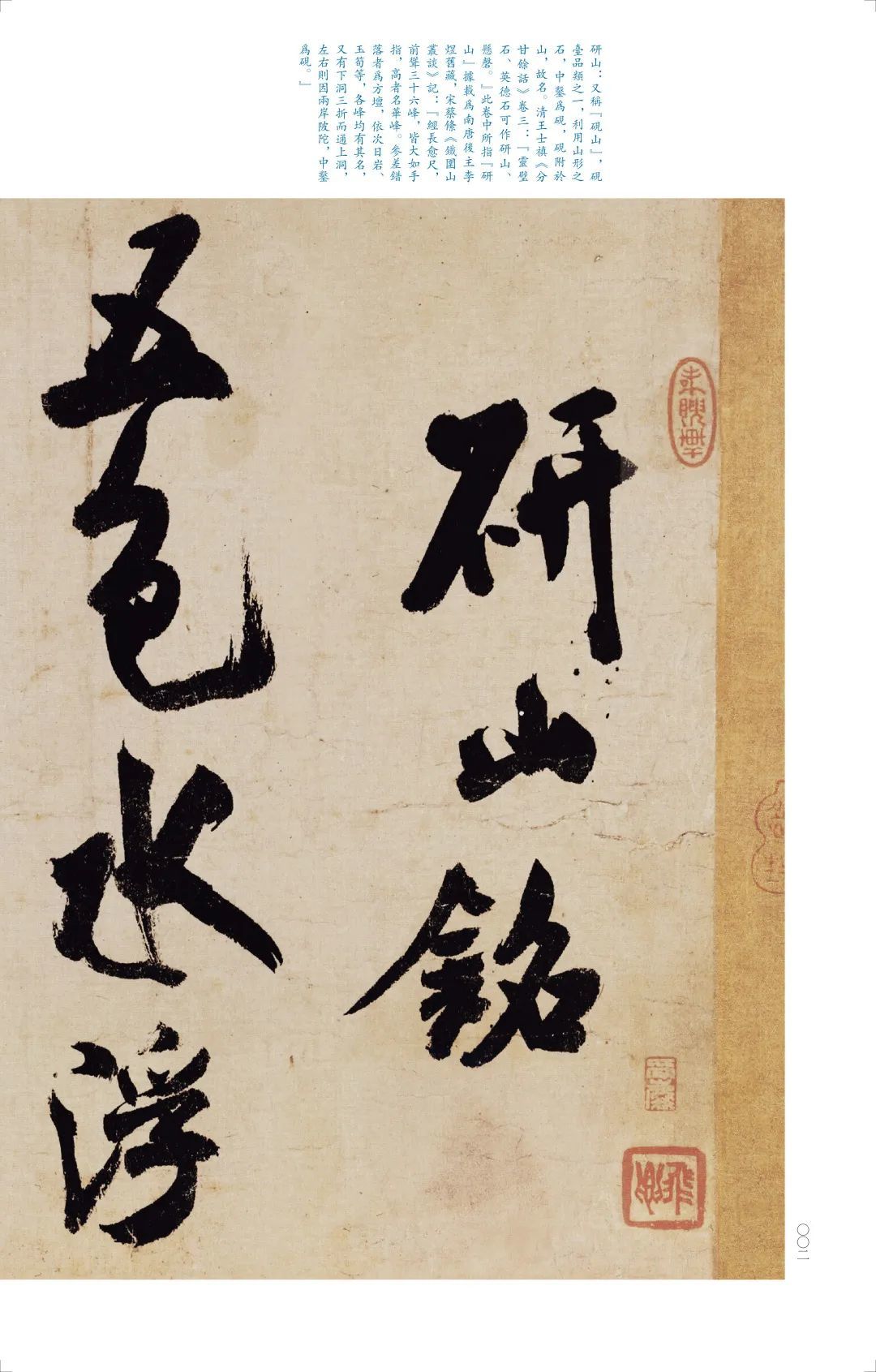 •《研山铭》,纸本,手卷,行书。内容系赞美灵璧石“研山”之辞,相传为后主李煜旧藏。其书宕跃雄快,骏迈放达,气势飞扬,飘逸超神。日本前首相犬养毅题引首“鸢飞鱼跃”,卷后有《研山图》及米友仁、王庭筠题识。钤有“内府书印”“绍兴”“悦生”“于腾”“味腴轩”“于腾私印”“受麟”“受麟私印”“飞卿”“湘石过眼”“周于礼印”“立崖”“石父”“封”等印。此卷流传有绪,于明张丑《真迹日录》《清河书画舫》及清吴其贞《吴氏书画记》等皆有着录。历南宋贾似道、元代柯九思、清代于腾等收藏,后流落日本,于二〇〇二年由国家文物局购回。现藏故宫博物院。
