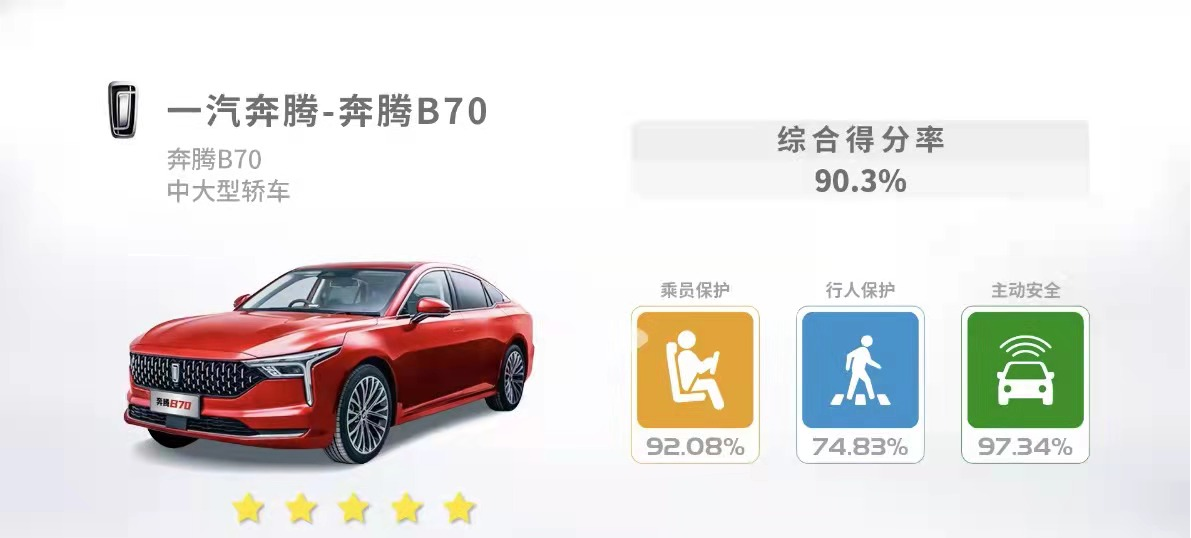 在最新一期公布的中汽中心C-NCAP车型碰撞评价结果中,第三代奔腾B70获得了五星安全认证,以90.3%的综合得分率技惊四座。而且奔腾B70是唯一一个连续两次获得C-NCAP五星评价的自主品牌车型,在乘员保护,行人保护,主动安全方面表现都十分优秀。它甚至超越了很多更贵数倍的合资车和进口车。现实就是这么扎心。
