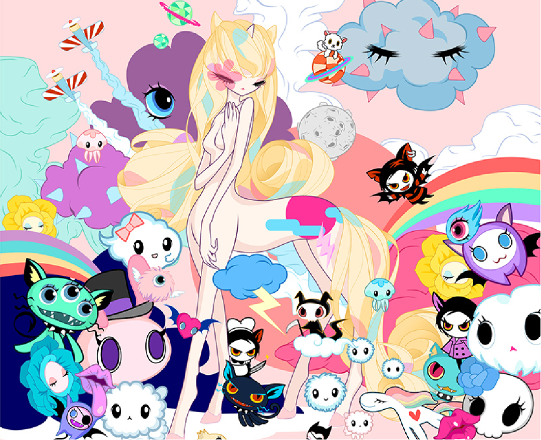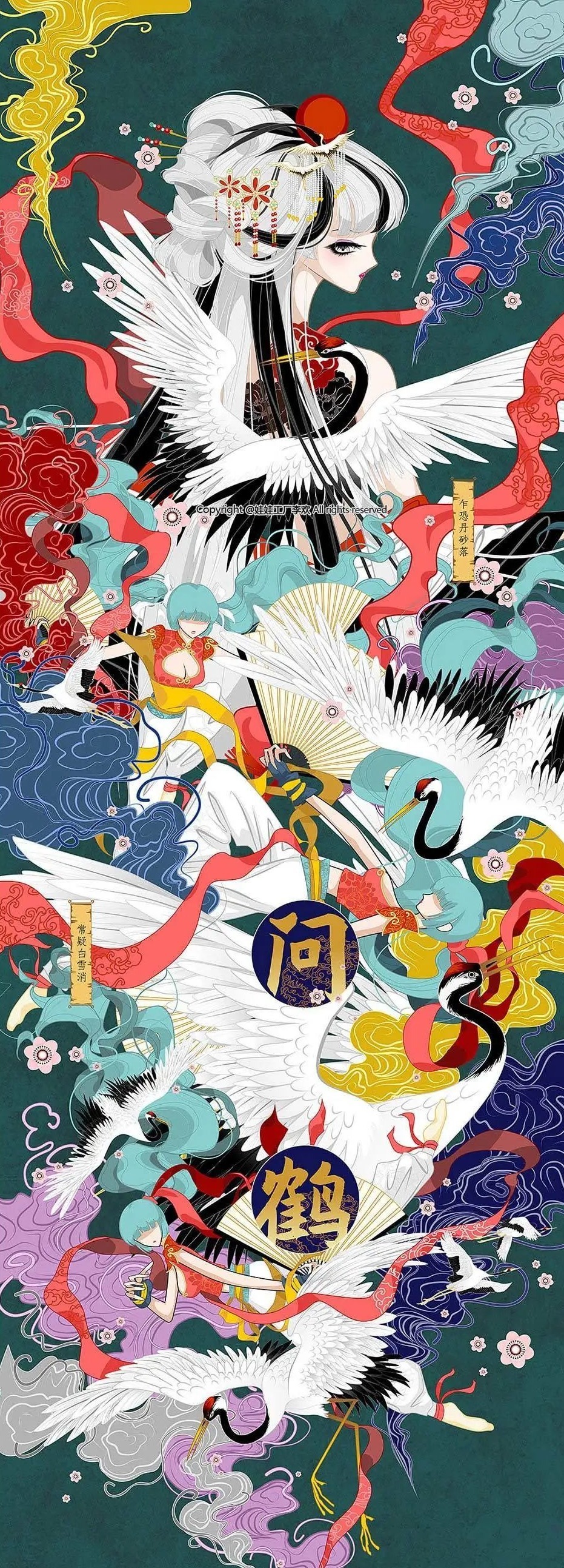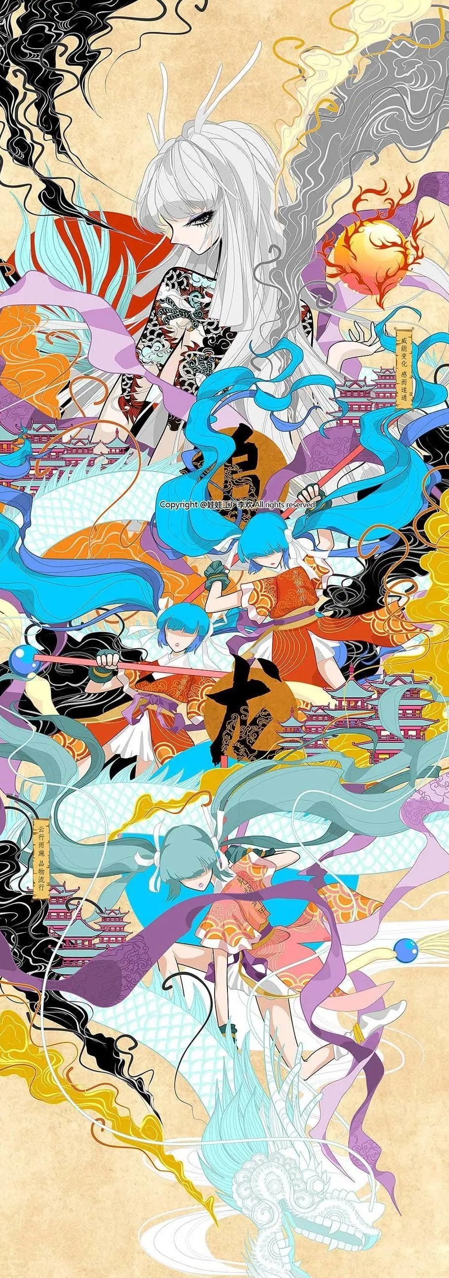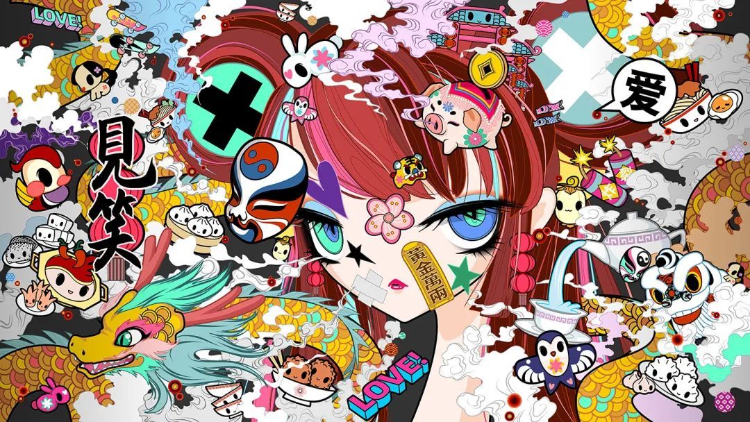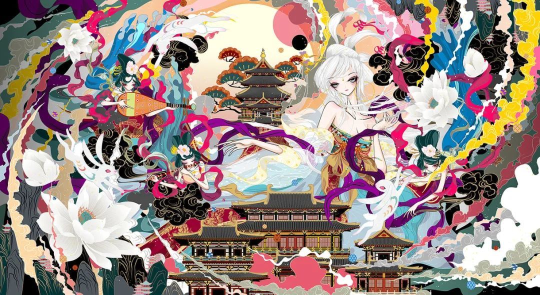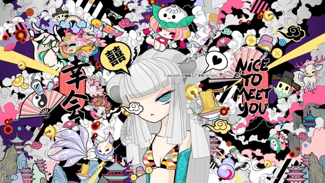 不同于我们一般印象里,中式绘画的淡雅内敛,欢叔(李欢)的作品总是充满张扬与玩味。作为潮流文化的爱好者与传统文化的推广者,他不断尝试将中国传统文化的各类象征物与二次元、波普艺术、哥特文化等解构重组,创造出了全新的融合性国潮艺术表现风格。其明艳繁复的色彩充满视觉冲击力,给人无尽的想象空间,征服我们每一寸感官。