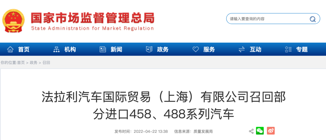 4月22日,法拉利汽车国际贸易(上海)有限公司根据《缺陷汽车产品召回管理条例》和《缺陷汽车产品召回管理条例实施办法》的要求,向国家市场监督管理总局备案了召回计划。自2022年5月30日起,召回2010年3月2日至2019年3月12日期间生产的部分进口458 Italia、458 Speciale、458 Speciale A、458 Spider、488 GTB和488 Spider系列汽车,共计2222辆。