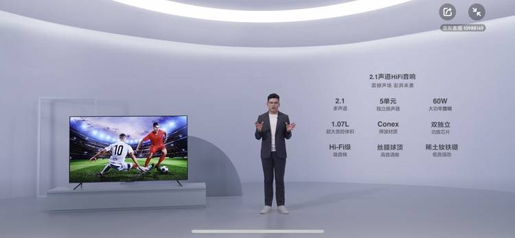 在声音方面,T7G内置了2.1声道HiFi音响,拥有5个独立扬声器,总计功率达60W,其中高音单元使用丝膜球顶,低音单元使用稀土钕铁硼,音腔体积达到1.07L,还有双独立功放芯片。而且还能使用智能AI声场技术,感觉室内空间,自动根据实际场景优化声音表现。