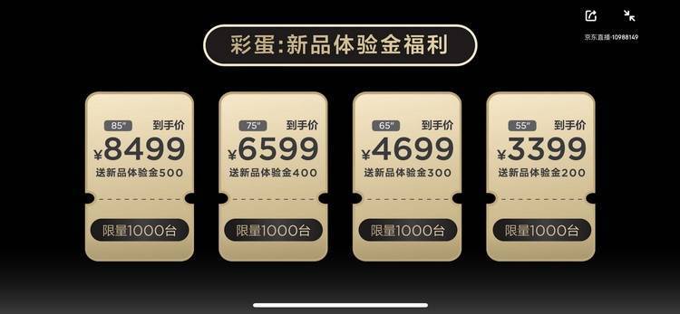 T7G已在8月22日19:40开始预售,将于8月26日20:00正式发售,85、75、65和55英寸零售价为10999元、7999元、5999元、3999元,首发价为8999元、6999元、4999元、3599元,每一个尺寸都有限量1000台优惠价,价格会进一步优惠到8499元、6599元、4699元以及3399元。