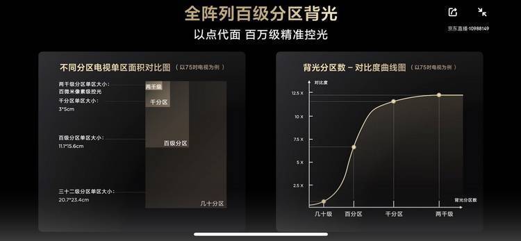随着技术成熟,市场上涌现了一大批4K120Hz电视,为了拉开与竞品的差距,TCL T7G不但采用了刷新率更高的4K 144Hz面板,而且将背光分区数量提升到一百个。在液晶电视进入LED背光时代后,得益于LED光源的小型化与数量增加,实现背光变得更为简单,但是市场上LED电视大多数背光分区只有数十个。TCL研究了背光分区数量与动态对比度的关系(基于75英寸),在背光分区提升1000个后,动态对比度会有大幅度提升,从1000个增加2000个,动态对比度会有提升,但是提升不大。不过1000个背光分区成本实在太高,无法普及开来,因此在T7G上TCL选了100个背光分区,它每个背光分区大小为1.1*15.6cm,动态对比度虽然比不上1000个背光分区,但是远远优于数十个背光分区,性价比突出。