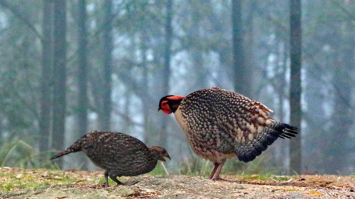 黄腹角雉:是鸟纲、雉科中国特产的一种鸟类。体长约50-65厘米。雄鸟上体栗褐色,满布具黑缘的淡黄色圆斑。头顶黑色,具黑色与栗红色羽冠。飞羽黑褐带棕黄斑。下体几纯棕黄,因腹部羽毛呈皮黄色,故名“黄腹角雉”。有翠蓝色及朱红色组成的艳丽肉裙及翠蓝色肉角,于发情时向雌鸟展示。雌鸟通体大都棕褐色,密布黑、棕黄及白色细纹,上体散有黑斑,下体多有白斑。