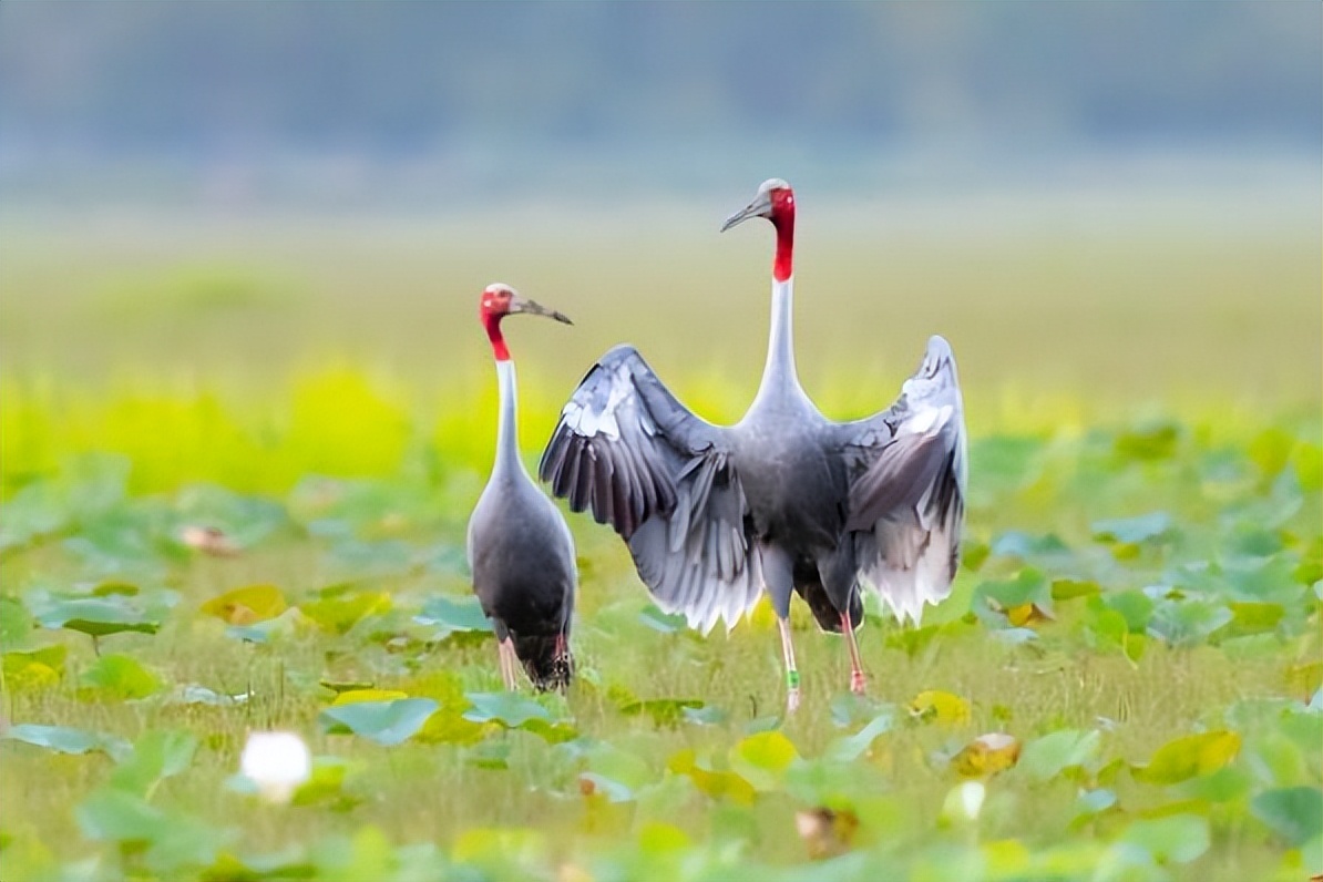 赤颈鹤:是大型涉禽,共分化为3个亚种。后趾小而高位,不能与前三趾对握,因此不能栖息在树上;全身羽毛大致呈浅灰色,成鸟颈部裸露红色的皮肤。初级飞羽和初级覆羽为黑色,白色而修长的内侧飞羽垂直的覆盖着尾部。嘴灰绿而脚粉红。栖息于多草的平原、水田、沼泽湿地及森林边缘。以稻谷及水生植物的根、块茎为食,也取食鱼类和蛙类。7-12月份繁殖,筑巢于沼泽地带成团的植物丛中,以水生植物茎、叶筑成。每窝产卵2枚,绿色或粉红白色,具褐色和紫色斑点。雌鸟孵卵,雄鸟守卫,孵卵期30天,由双亲共同照料幼雏。分布于印度、缅甸、泰国、马来西亚、澳大利亚和中国的云南盈江和西双版纳等地。